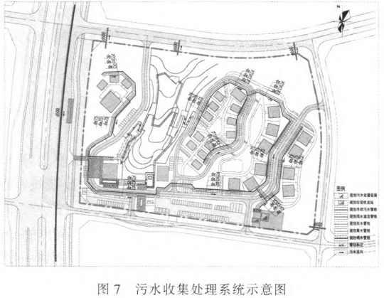 在园区东南角设置污水资源化中心1座,设置灰 水、黄水和褐水3套污水处理工艺,其中灰水处理设施 按再生水标准设计,资源化中心总占地面积约780m2。并设置灰水、黄水、褐水3套负压排水管道,将污水分类收集并输送至资源中心,如图7所示。